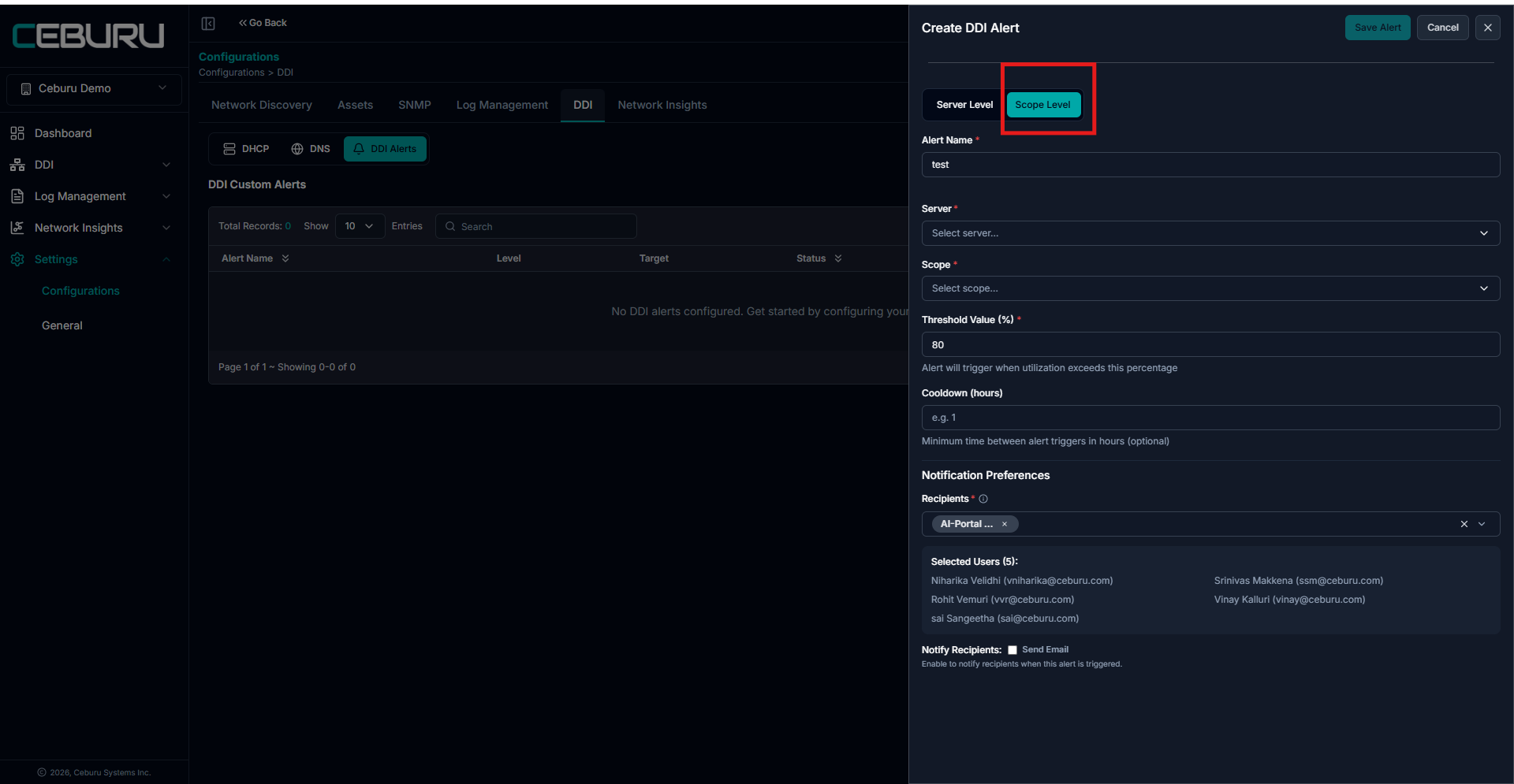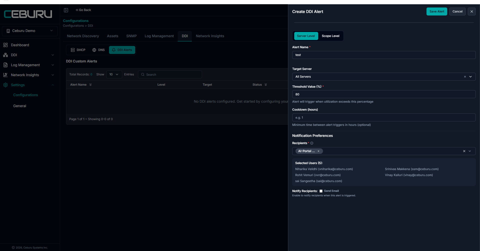 Click Configure Alerts to open the Create DDI Alert panel.