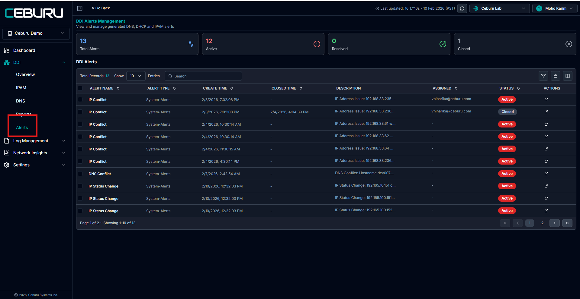 Each alert provides actions to assign, resolve, or close the alert.