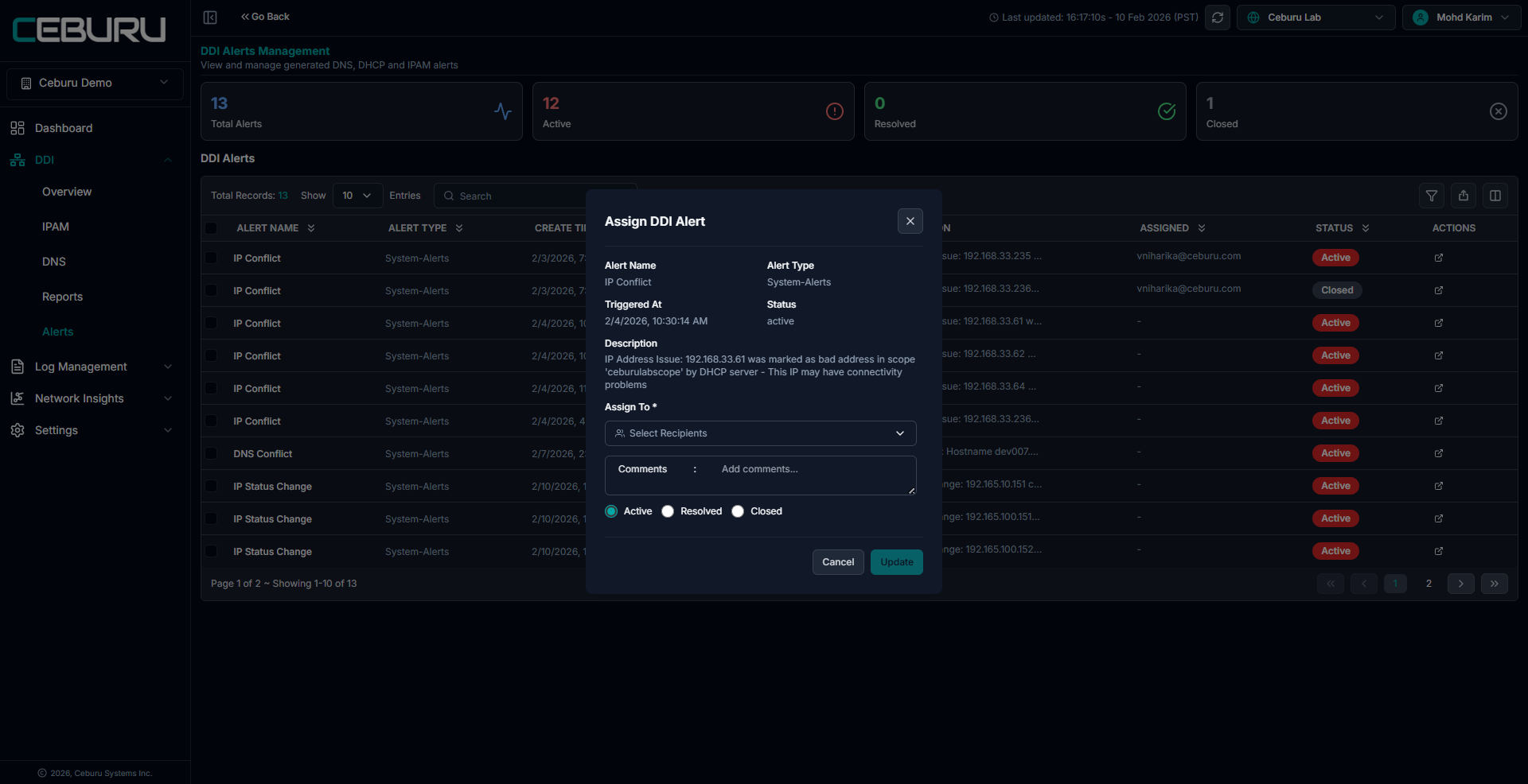Click the action icon on an alert to open the Assign DDI Alert panel.