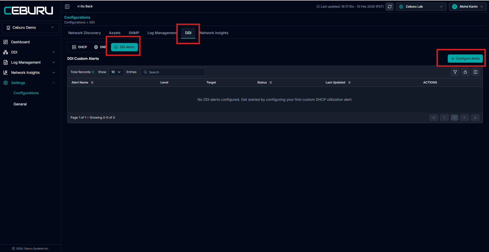 DDI alerts are configured from Settings → Configurations → DDI → DDI Alerts and are monitored centrally under DDI → Alerts.