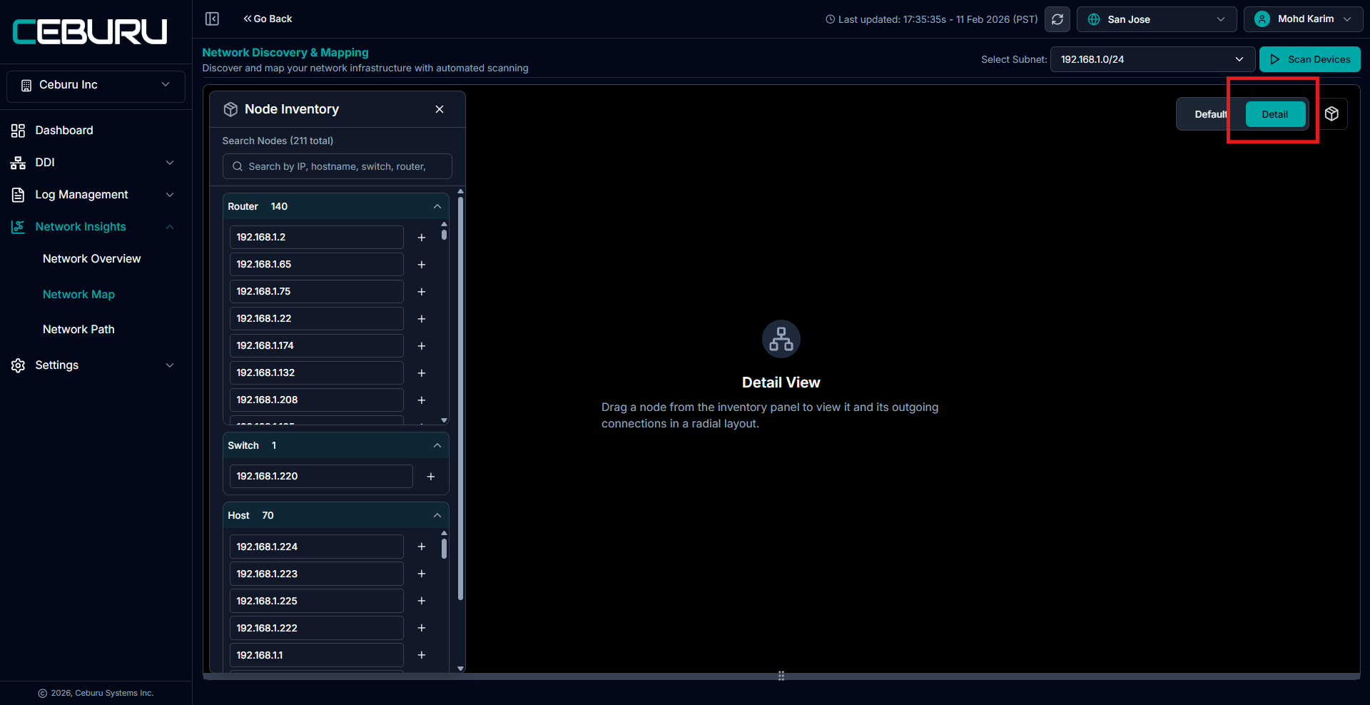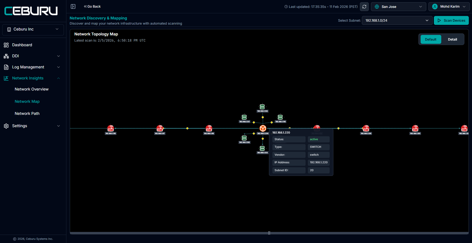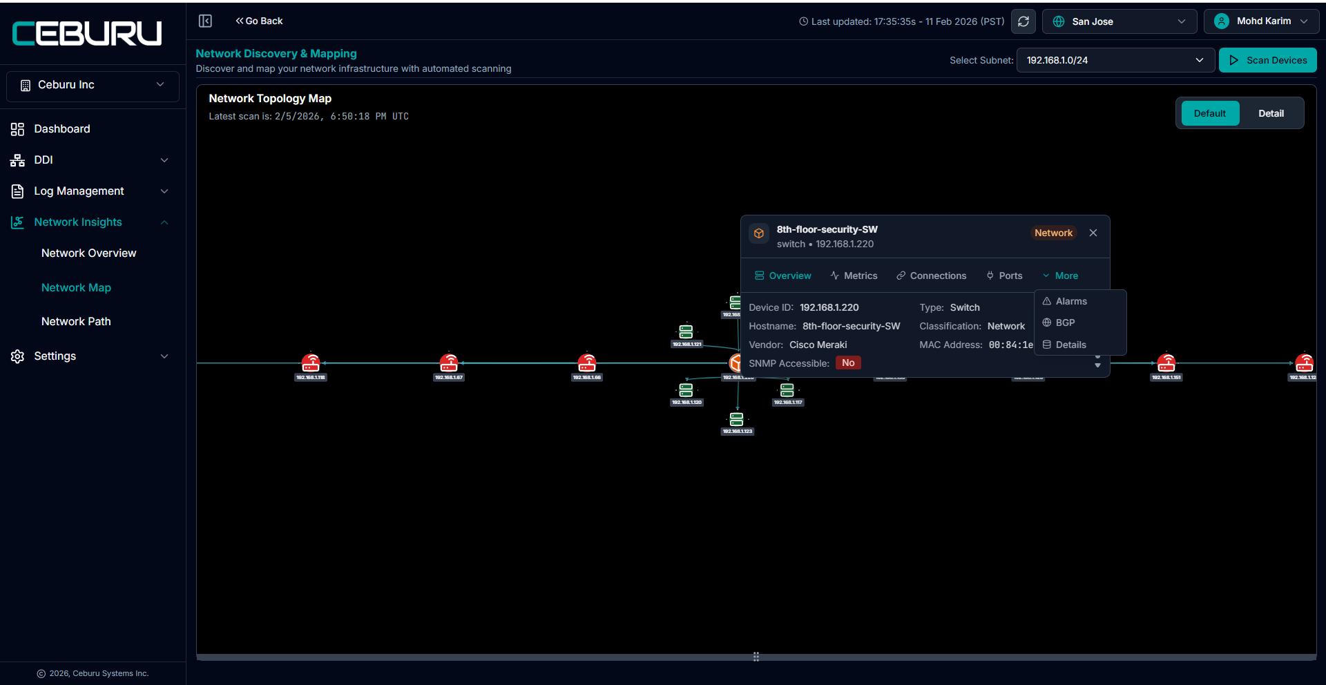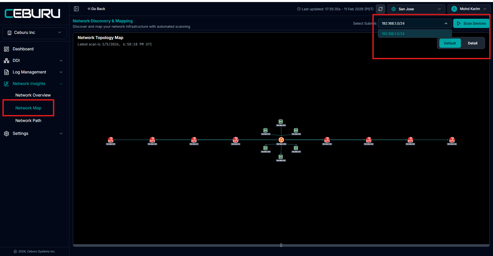 The NetMap Dashboard under Network Insights → Network Map provides a visual topology of your scanned subnet, along with a structured node inventory and connection mapping.